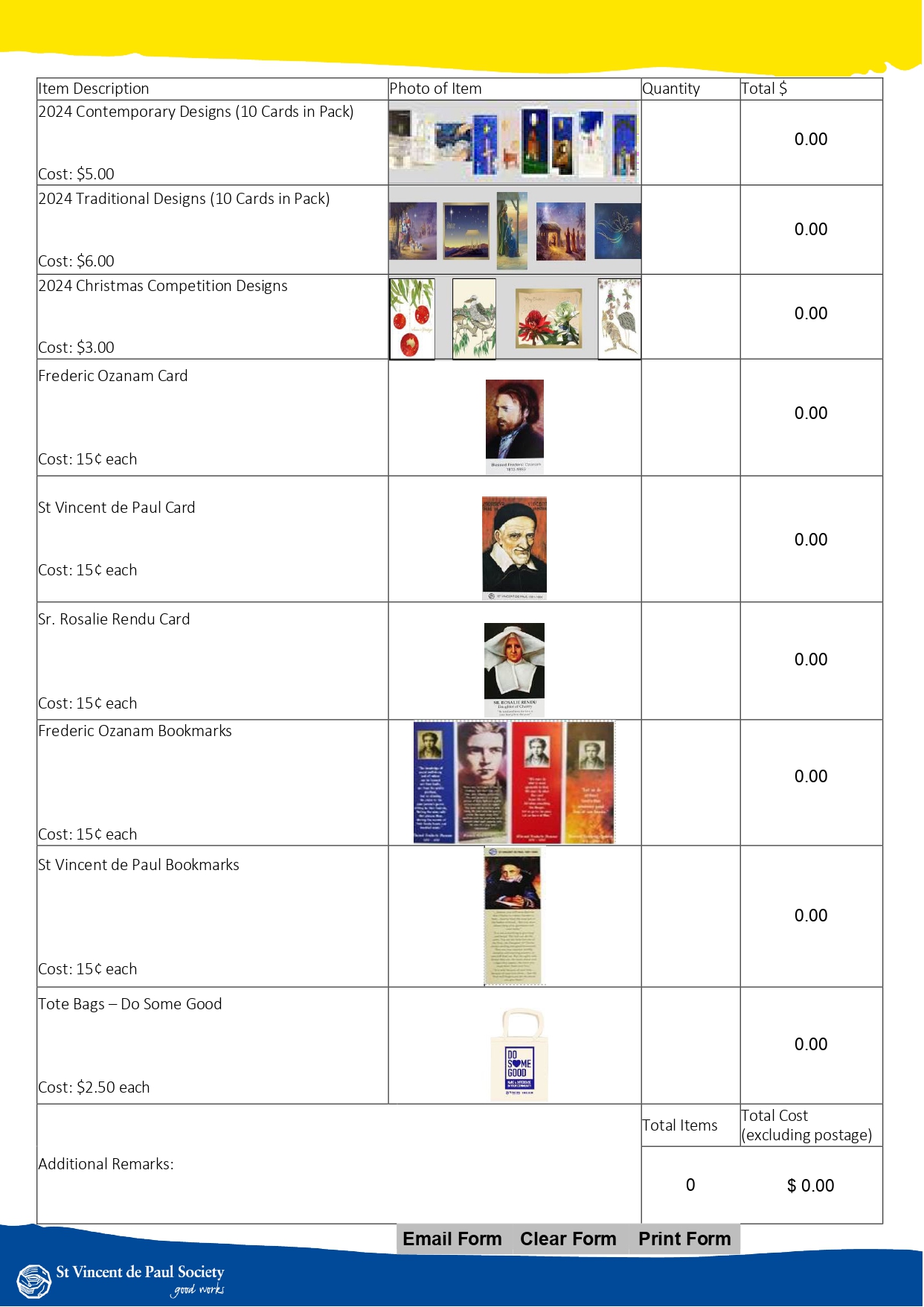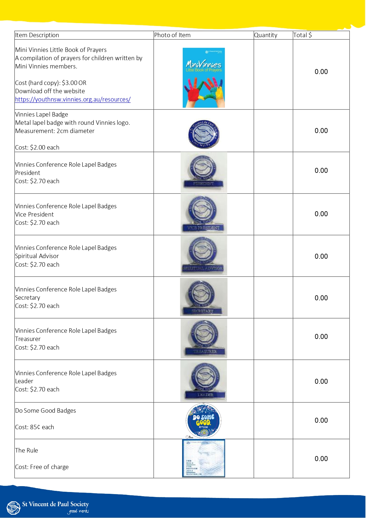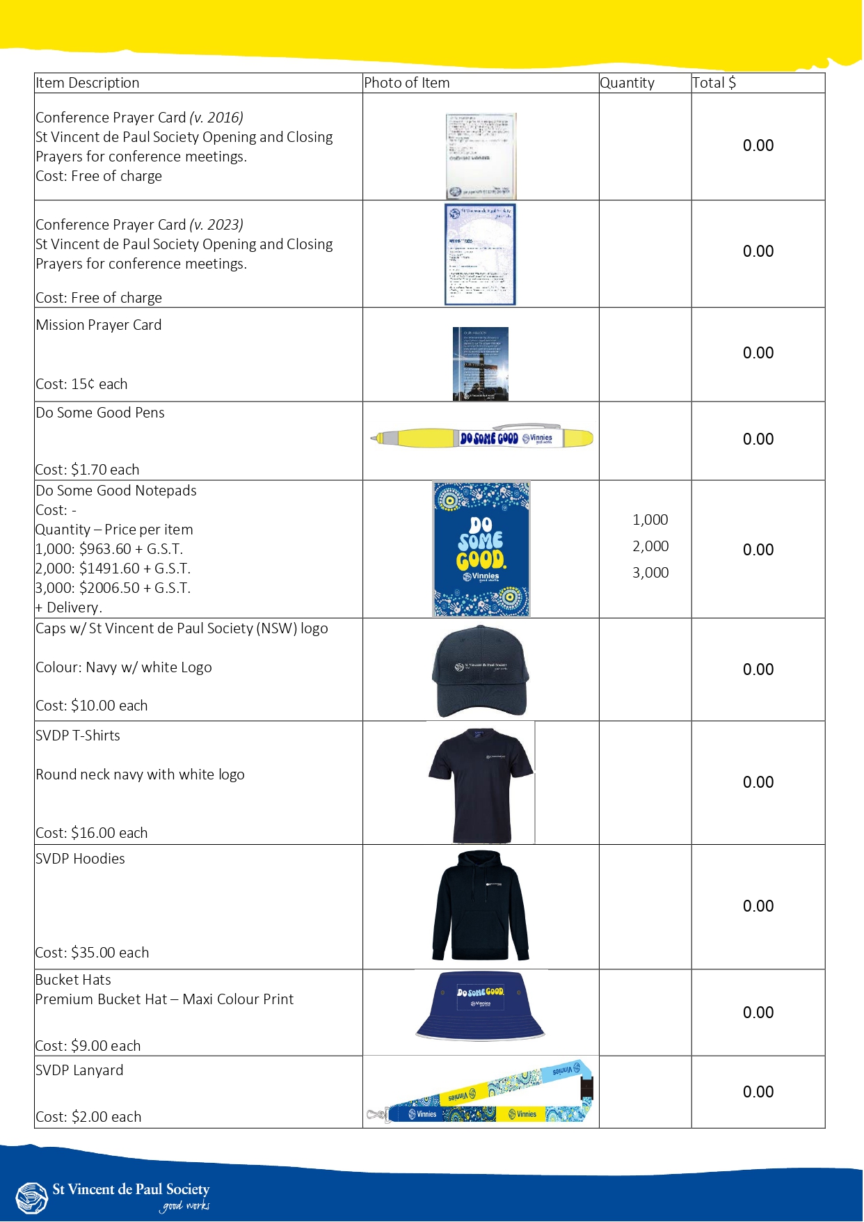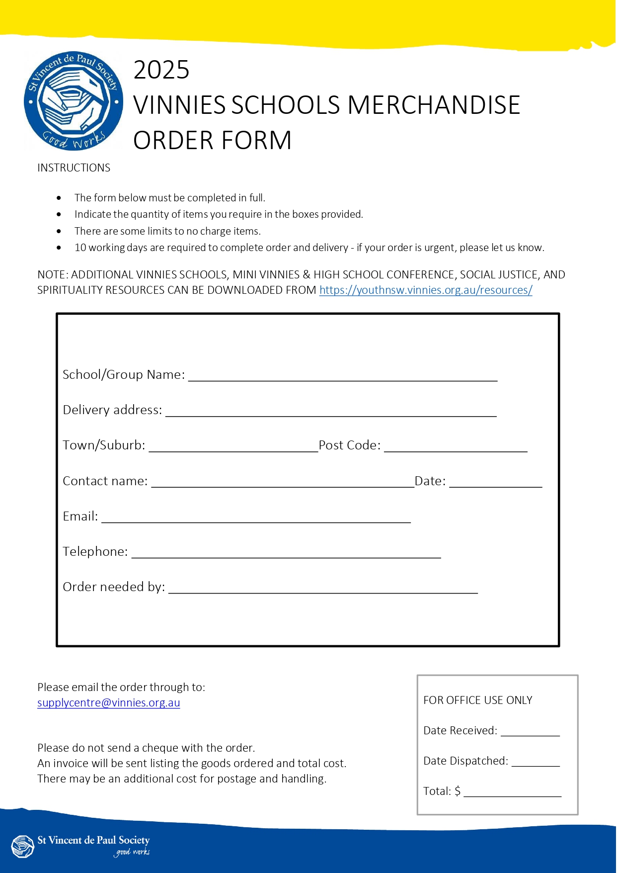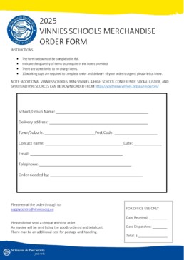 Please complete the Vinnies Supply Centre Order Form and send to supplycentre@vinnies.org.au